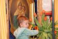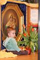 Wie Aurelia sich freut, vor der Gottesmutter und den Tulpen...